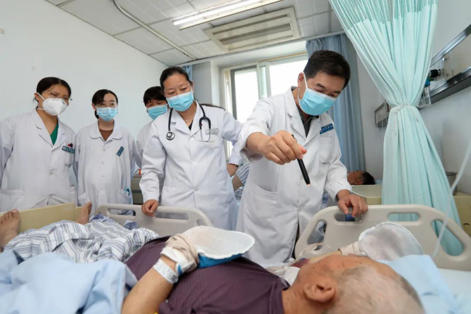 在与患者及三位子女进行充分沟通后,血液科申请了全院多科室讨论,确定了全脑姑息性放疗桥接CAR-T的治疗方案。为保证该患者CAR-T治疗顺利进行,由血液科牵头,放疗科、呼吸与危重症医学科、神经外科、神经内科、影像科、核医学科、药剂科、心内科、康复科等多个科室共同协作,在有效改善患者一般情况后,于4月24日顺利完成了CAR-T细胞回输。回输后,血液科全程动态监测患者病情变化并及时处置,为患者提供了全面保障。治疗过程中也邀请多学科进行动态会诊评估,最终平稳渡过治疗期。
