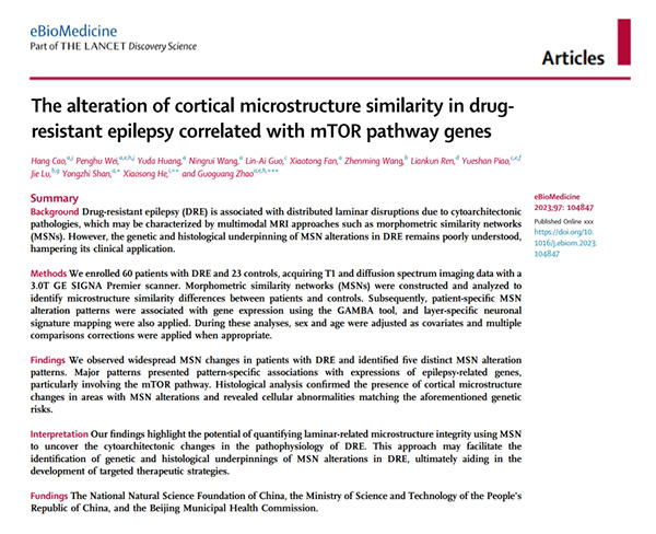 近日,首都医科大学宣武医院赵国光教授团队,联合中国科大何晓松研究员团队,在柳叶刀子刊《eBioMedicine》(实时影响因子:14.9)上发表了题为“The alteration of cortical microstructure similarity in drug-resistant epilepsy correlated with mTOR pathway genes”的研究论文,该研究首次描绘了难治性癫痫(DRE)重要致病机制皮质发育异常相关的全脑分层组织特性改变图谱,并通过影像-基因组学联合分析方法发现mTOR信号通路异常等疾病经典分子病理学机制与异常脑图谱具有映射关系,为未来发展DRE精准无创评估工具提供了可能路径。宣武医院神经外科曹航医师及魏鹏虎副教授为共同第一作者,宣武医院赵国光教授、中国科学技术大学心理学系何晓松研究员、宣武医院神经外科单永治教授为文章共同通讯作者。