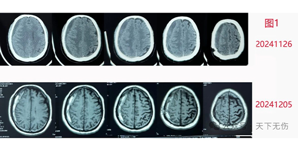 H先生,74岁。10月初发生严重外伤,诊断为脑挫裂伤,颅内积气,左侧硬膜下血肿。因意识尚可,北京某医院没有给他做手术,11月09日复查见血肿液化,但症状逐步加重,出现走路不稳、嗅觉异常和全身异常感觉。非常焦虑。家人陪他到我门诊,他话很少,是家人代叙。因为距离他最近检查的头CT已经接近1个月没有复查了,我说服他去做个头部磁共振。2小时后我看到片子(图2),高兴地恭喜他已经痊愈。我还告诉他和他的家人,脑外科已经无需治疗。追问病史,才得知,他也是在医生建议下自服阿托伐他汀钙,而且服用了43天。得知不必再治疗的消息后,他们开始简直不敢相信,当再次确认后,一家人高兴地带着患者离开,不说话的这位患者,临走时居然也笑着开口向我表达致谢了。